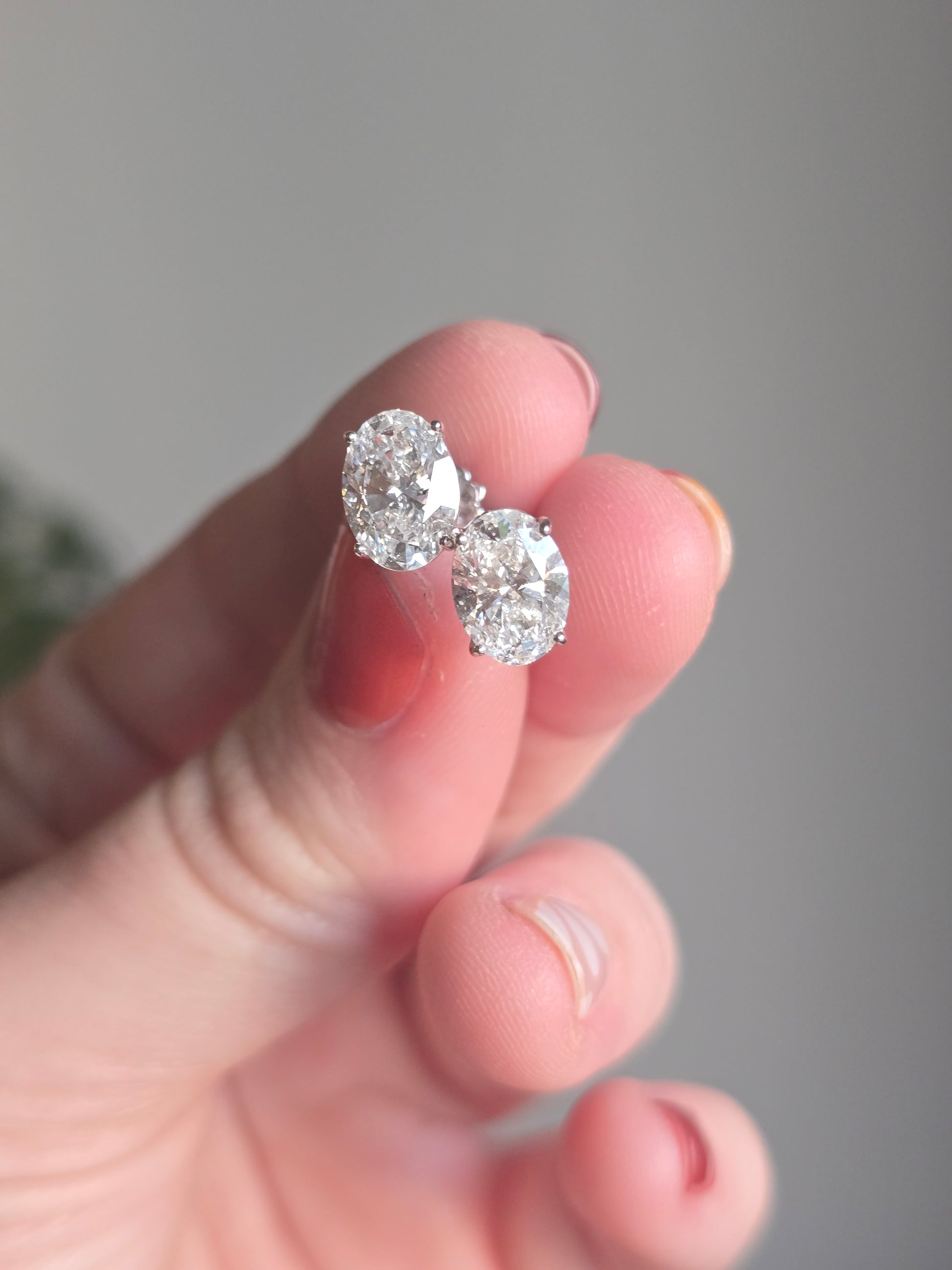 14k white gold studs with threaded posts for added security. They feature a combined 3.1ct of oval cut lab diamonds. IGI reports are included.