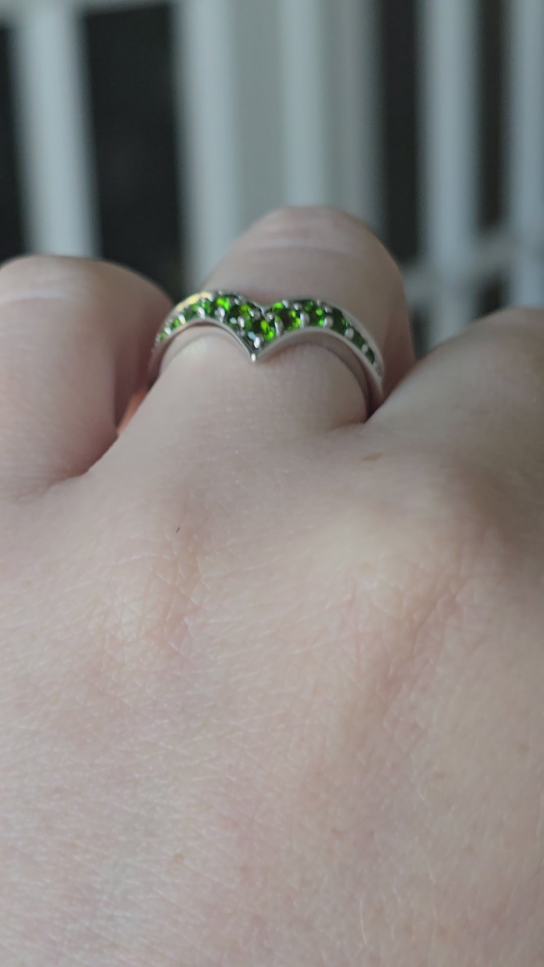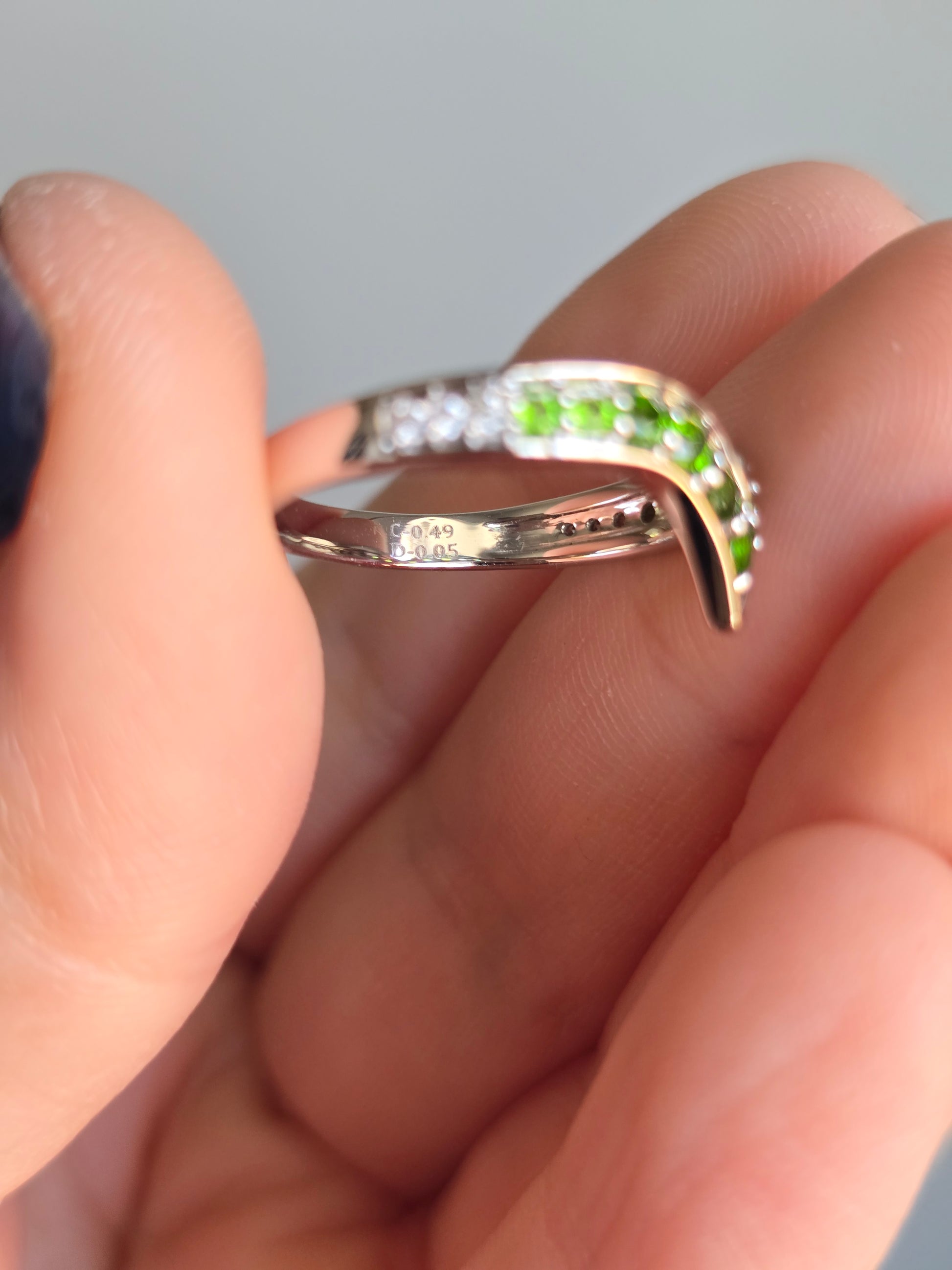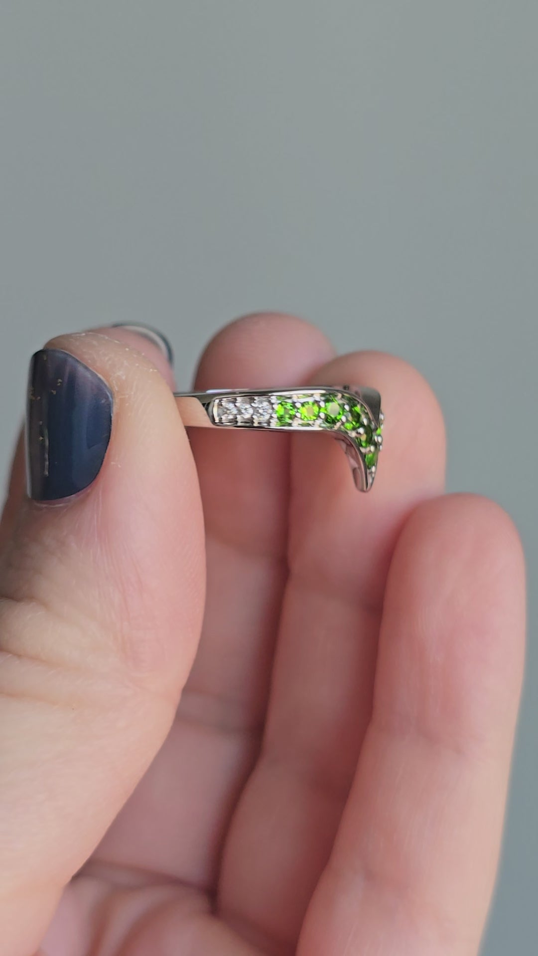 The Chromia 18k Diopside and Diamond Chevron Ring by Chevron showcases refined craftsmanship in radiant 18K gold. This size 7.25 ring features round faceted diopside stones ranging from 1.75 to 2.50 mm, accented with delicate round brilliant diamonds totaling 0.05 carats, graded G–H in color and SI1–SI2 in clarity. Weighing 3.60 grams, the sophisticated design combines subtle sparkle with timeless elegance, making it an exquisite addition to any jewelry collection.