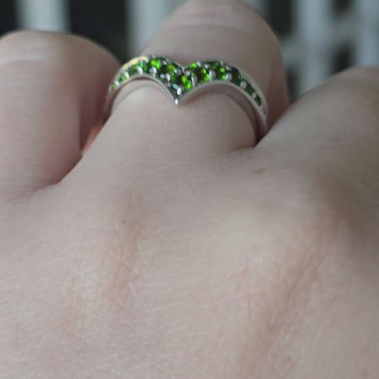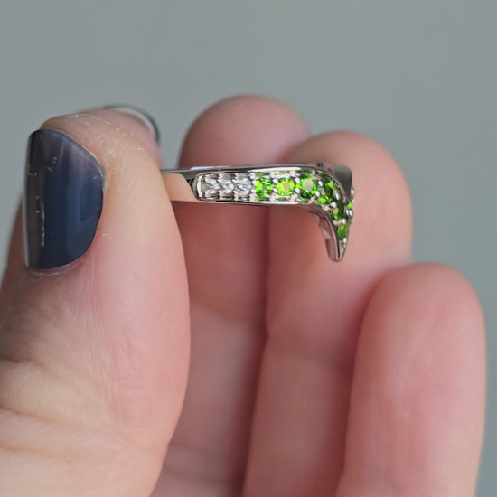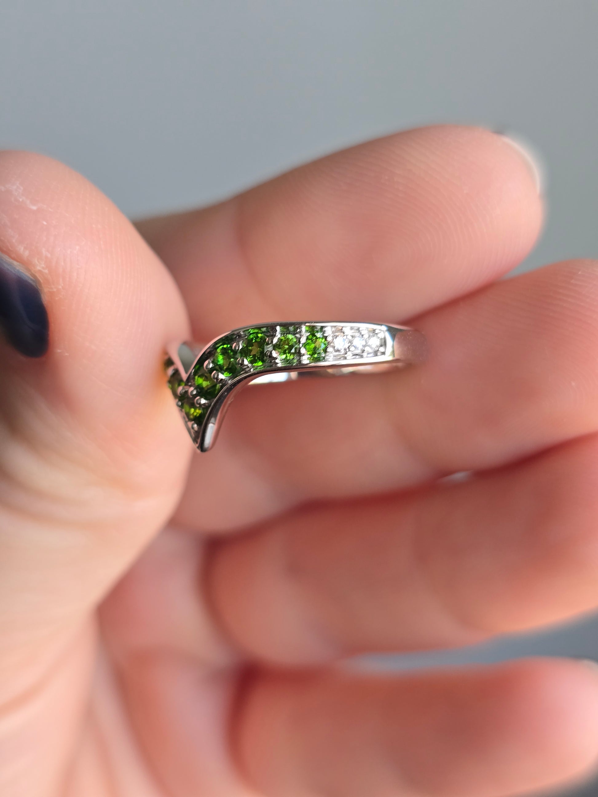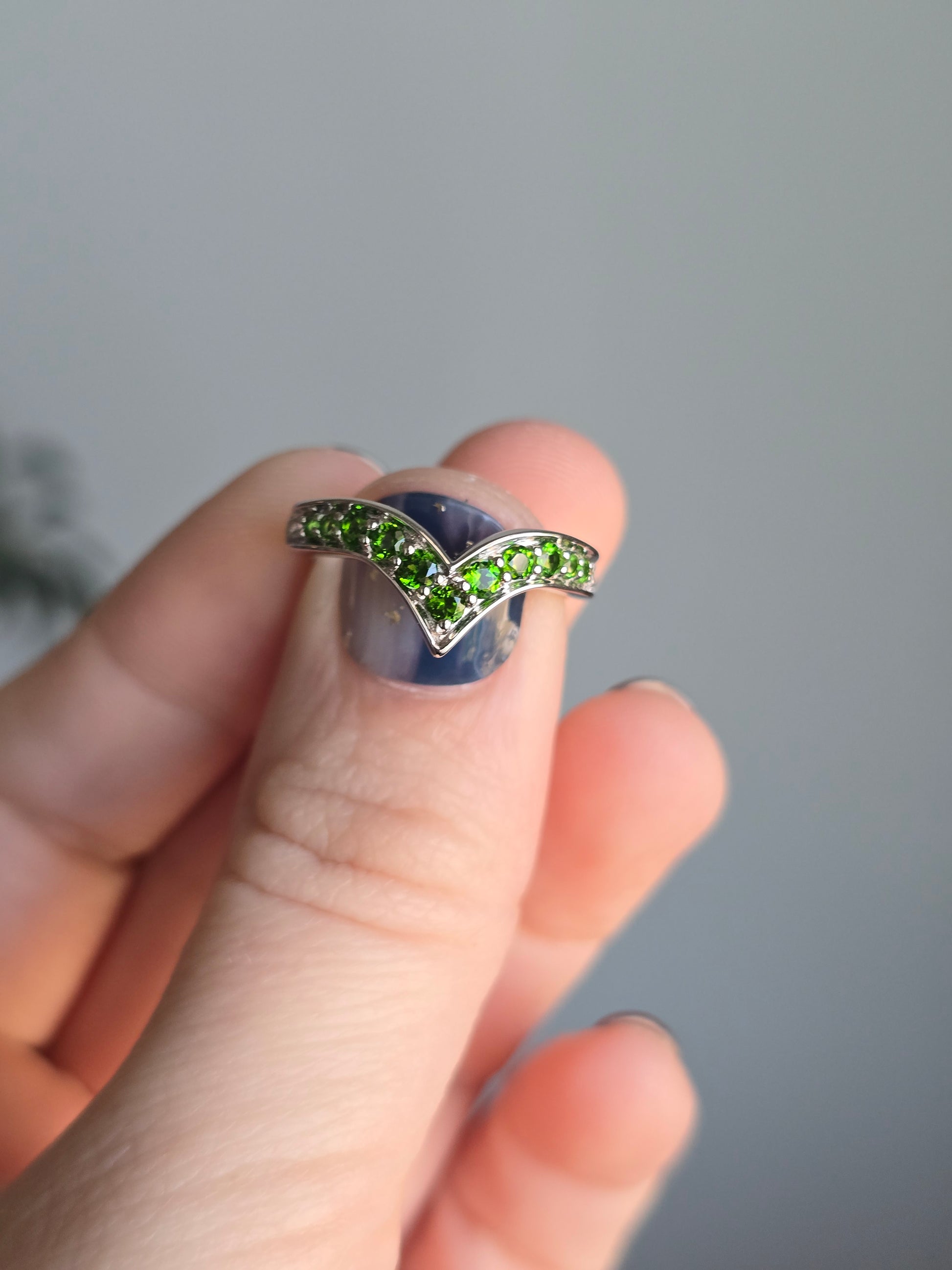 The Chromia 18k Diopside and Diamond Chevron Ring by Chevron showcases refined craftsmanship in radiant 18K gold. This size 7.25 ring features round faceted diopside stones ranging from 1.75 to 2.50 mm, accented with delicate round brilliant diamonds totaling 0.05 carats, graded G–H in color and SI1–SI2 in clarity. Weighing 3.60 grams, the sophisticated design combines subtle sparkle with timeless elegance, making it an exquisite addition to any jewelry collection.