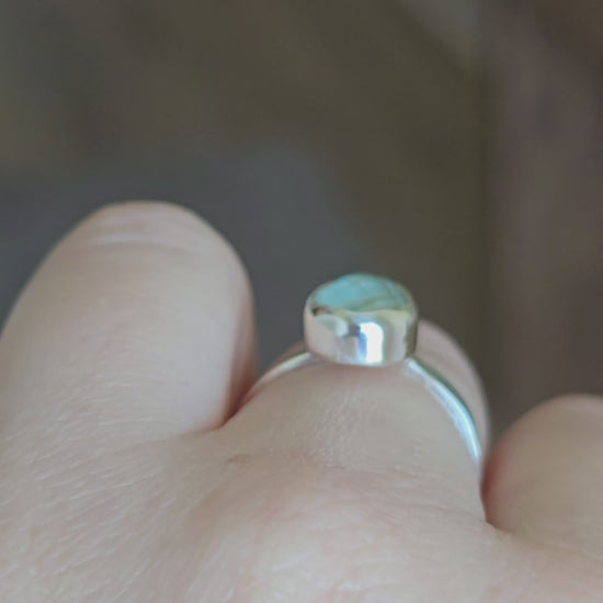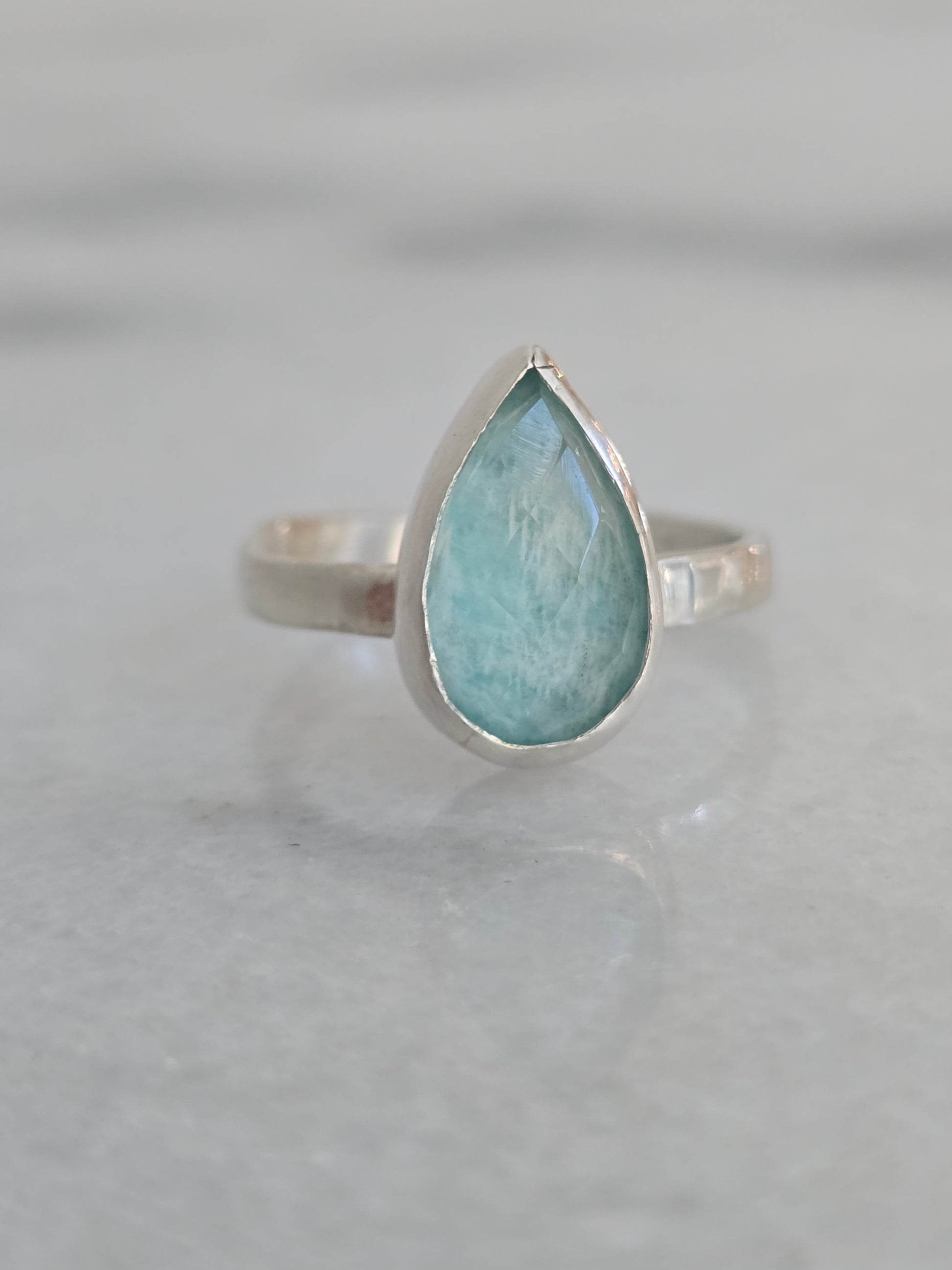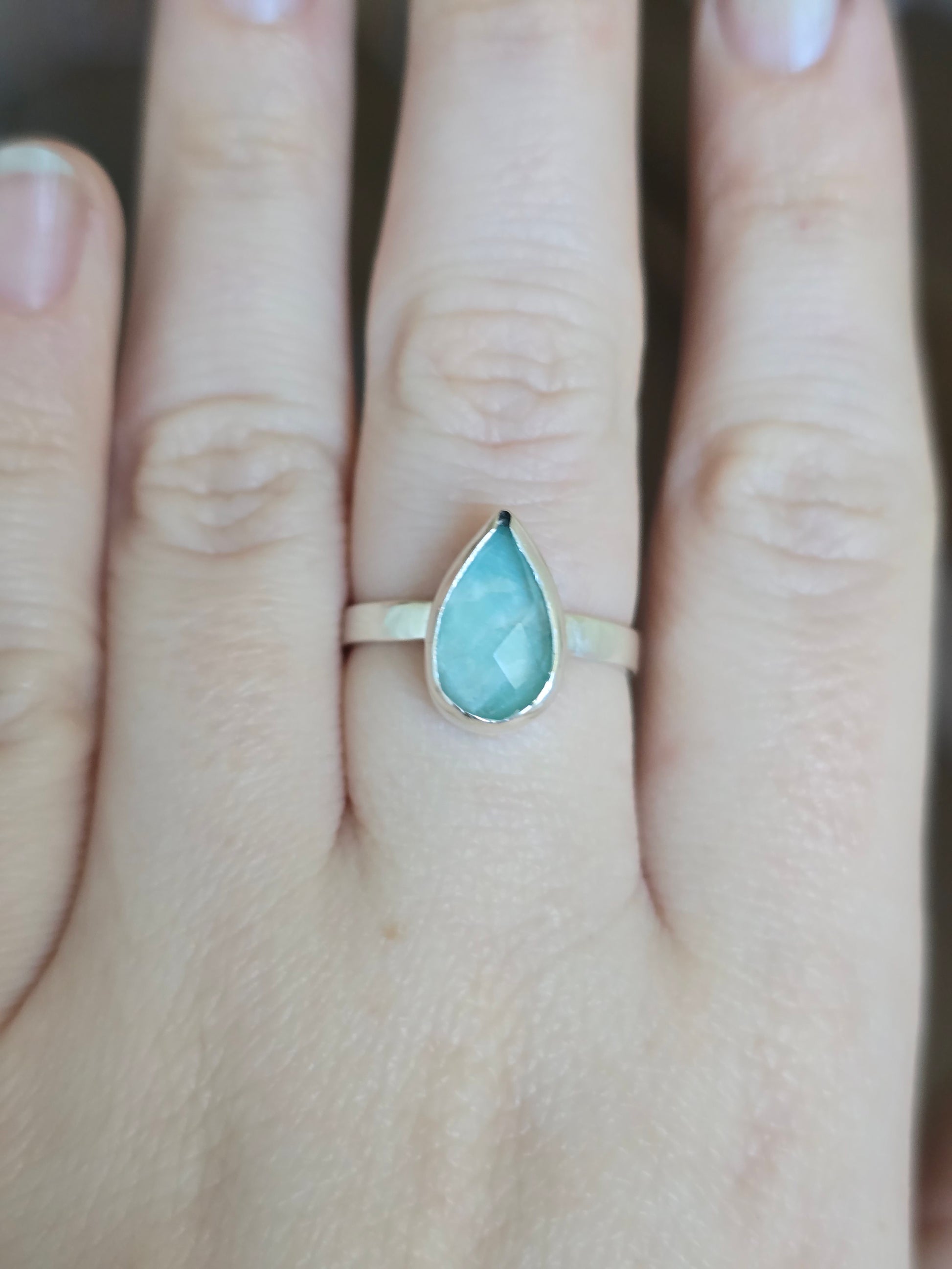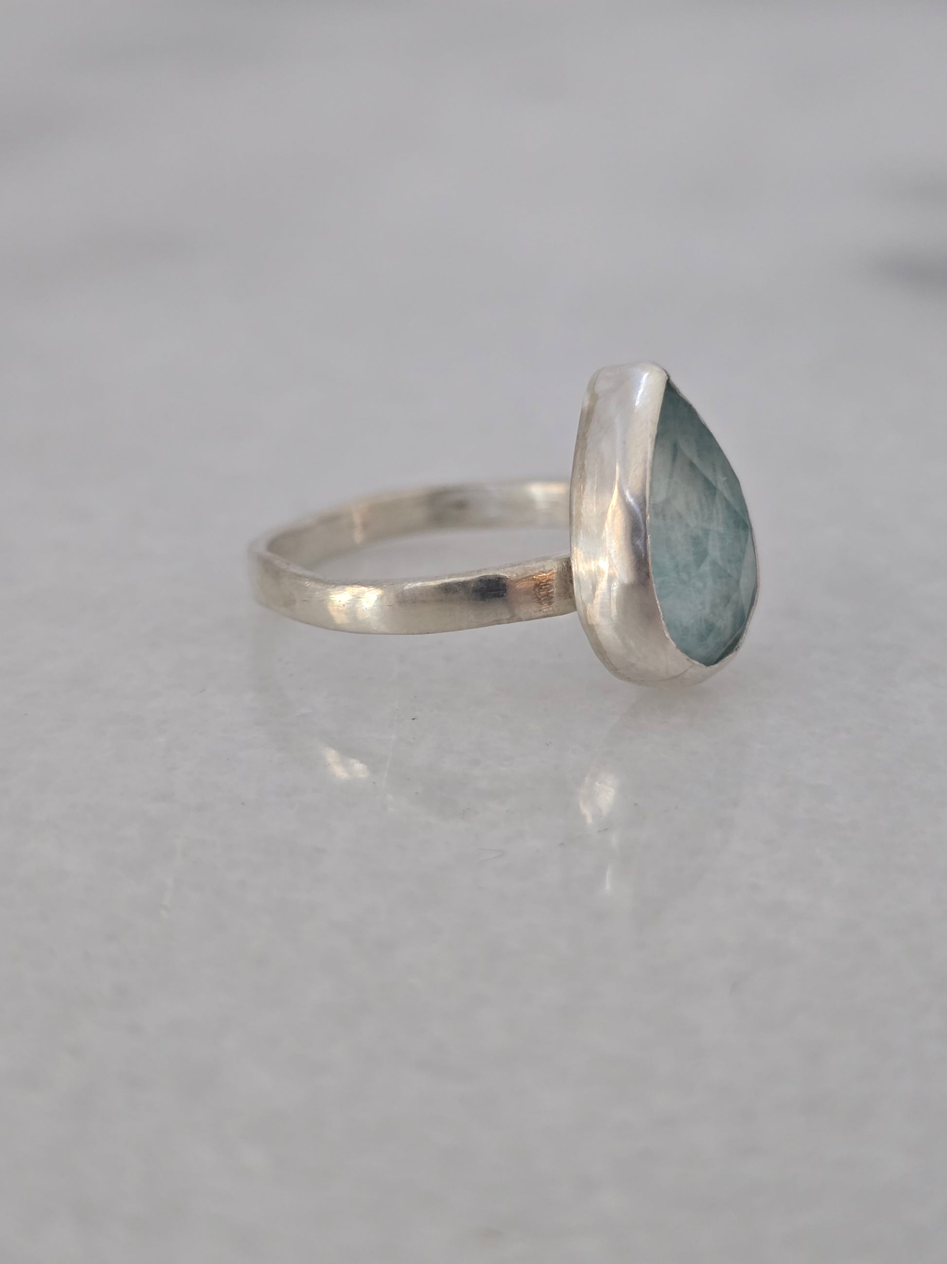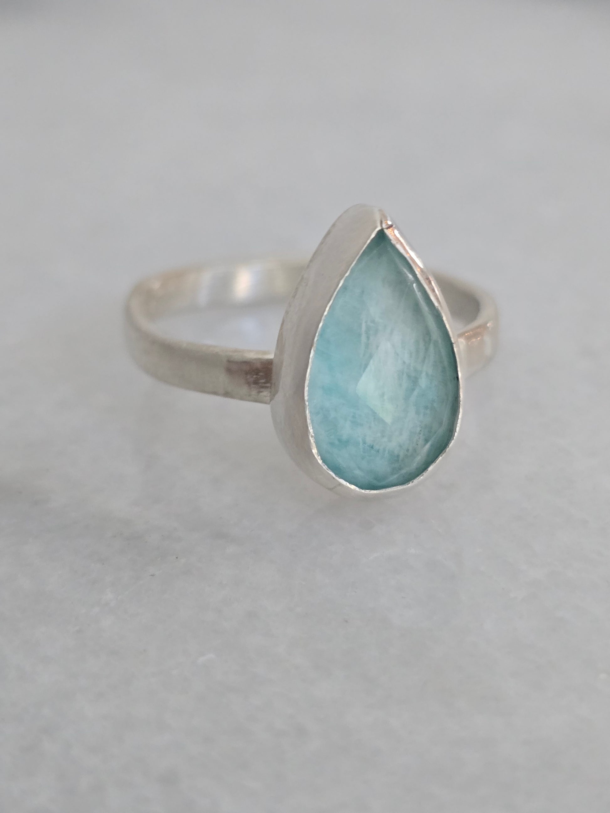 This handcrafted sterling silver ring features a bezel-set pear-shaped amazonite doublet, glowing with tranquil blue-green tones reminiscent of the sea. The smooth cabochon surface highlights the stone’s dreamy depth, while the minimalist silver setting keeps the focus on its natural beauty.