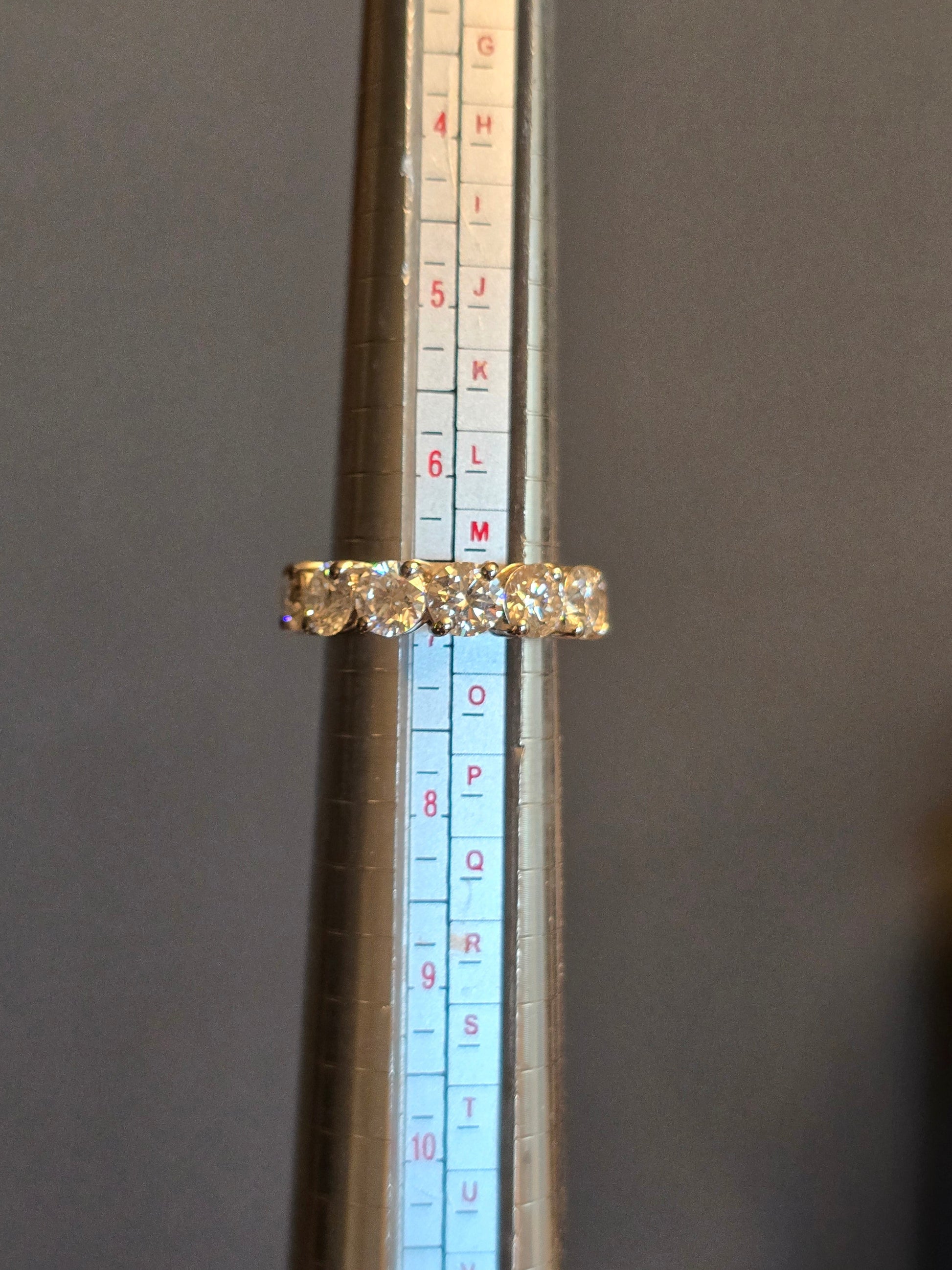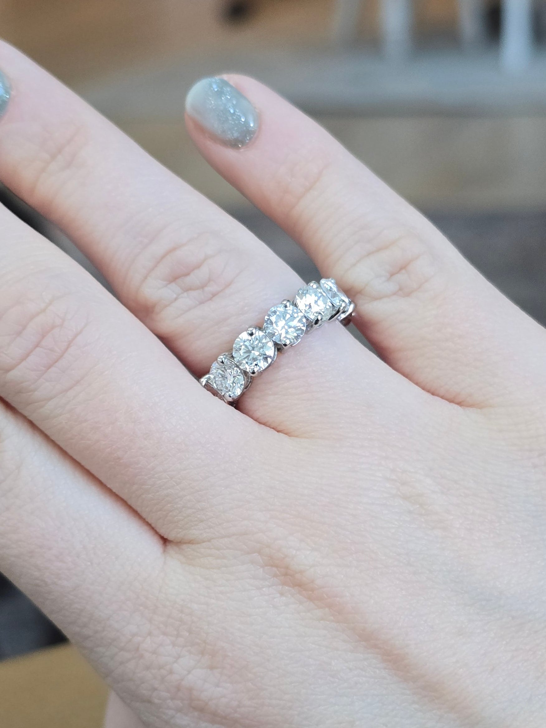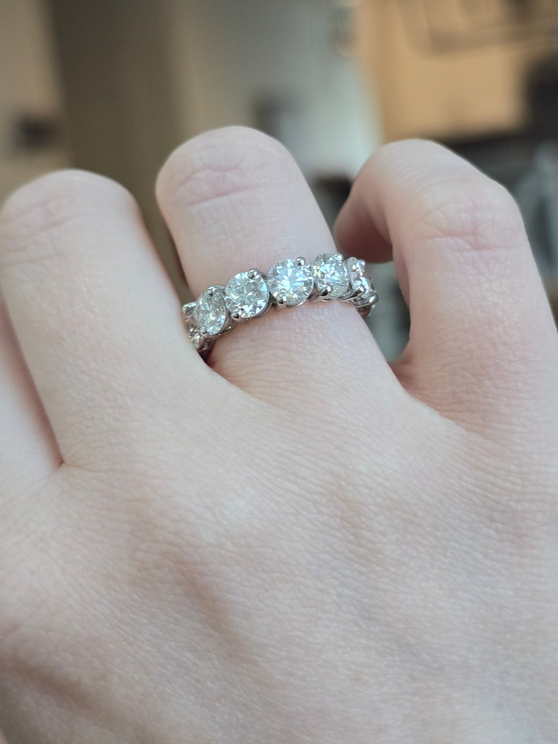 This stunning platinum band features 6.92 total carats of lab diamonds in D/E color, VVS1/VVS2 clarity. This band is stamped "PT950" and weighs 4.7 grams. The stones are approximately 5.1mm each.
