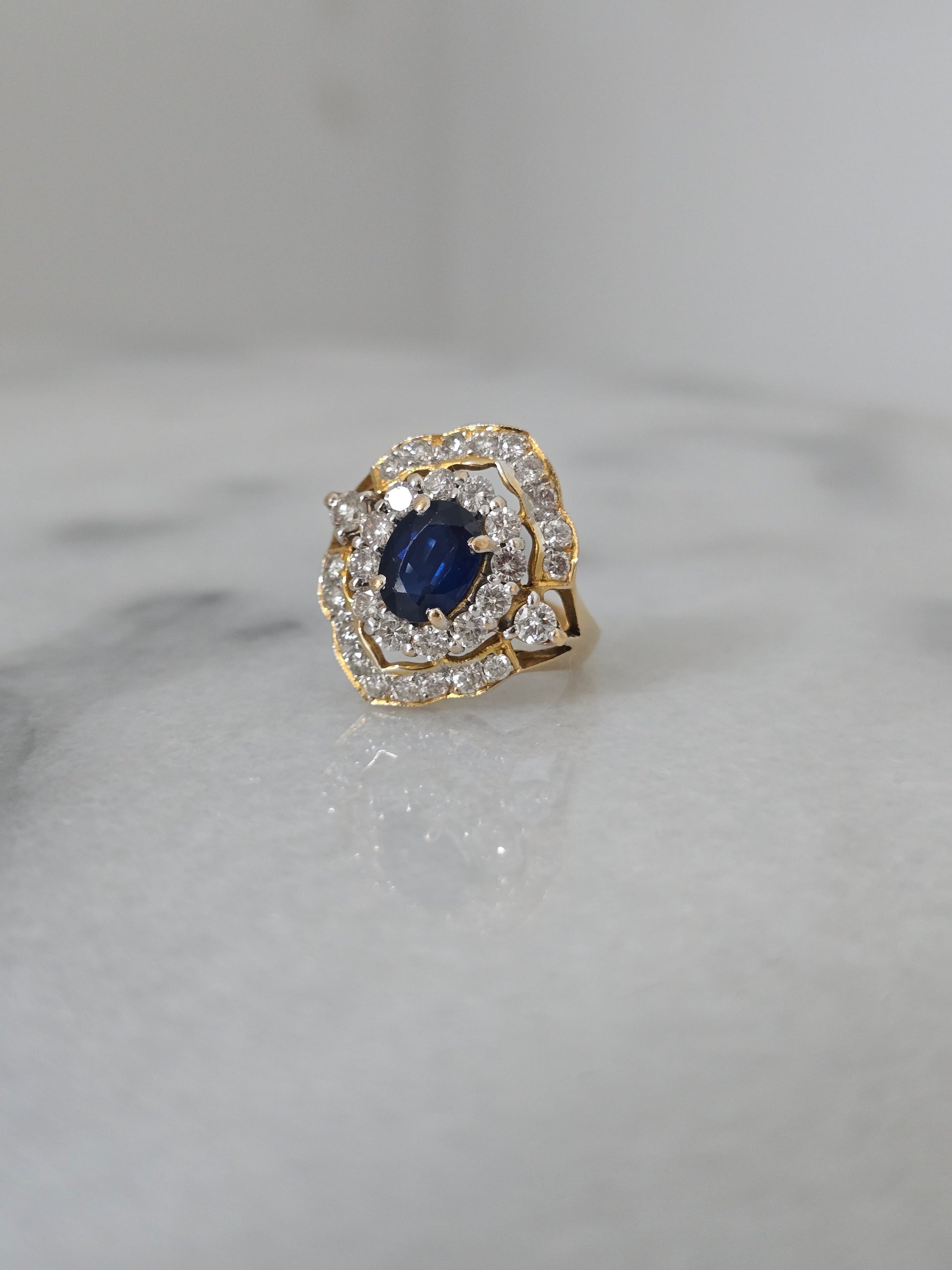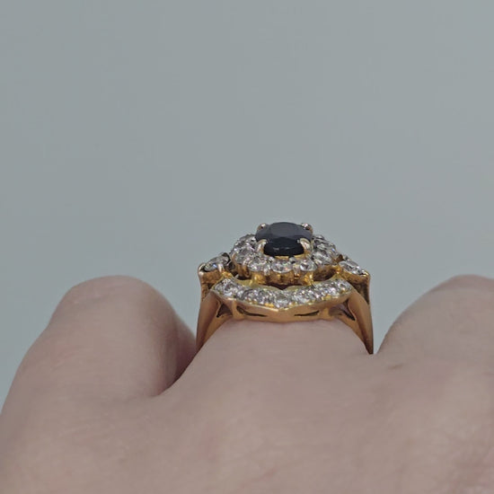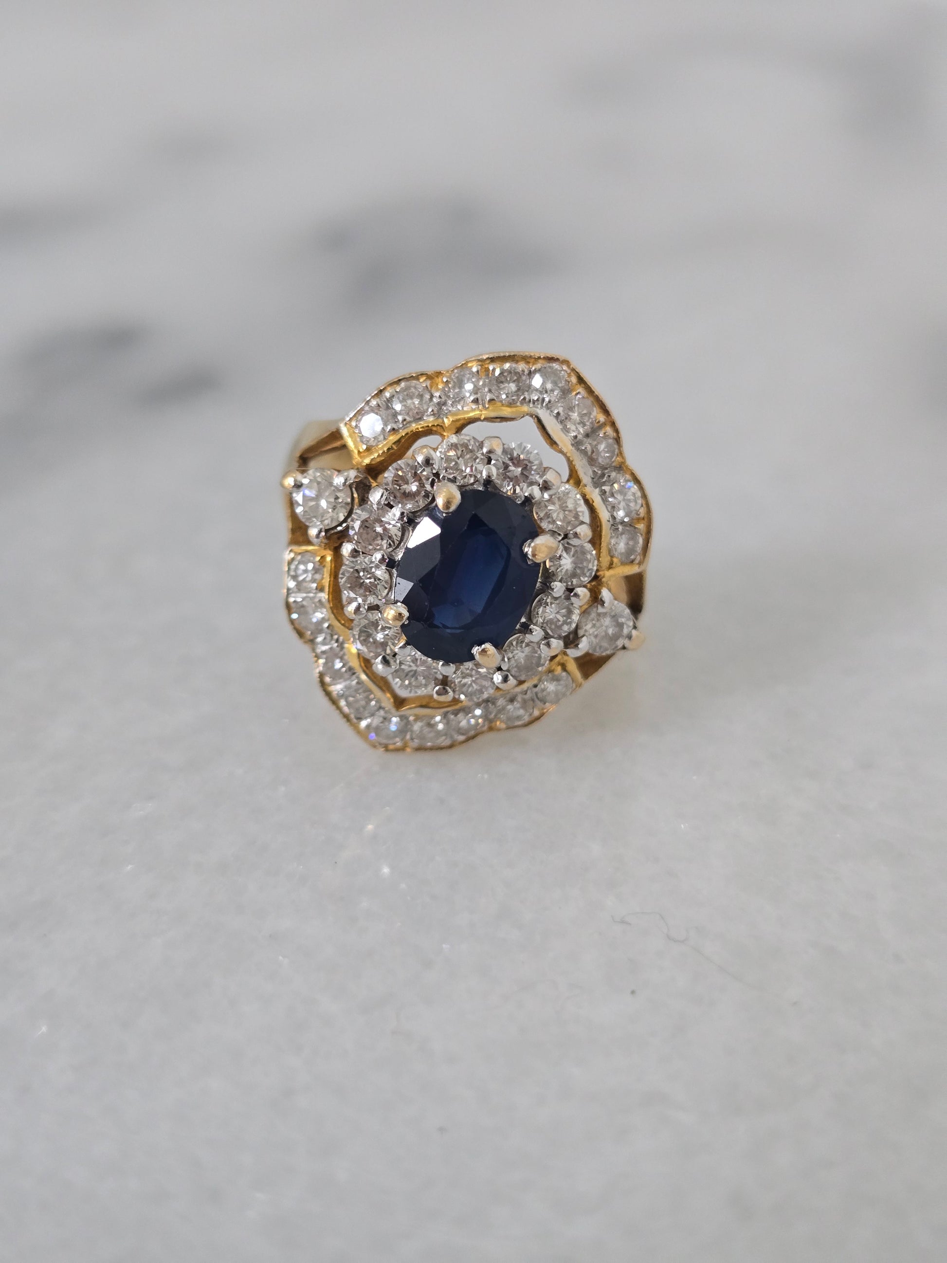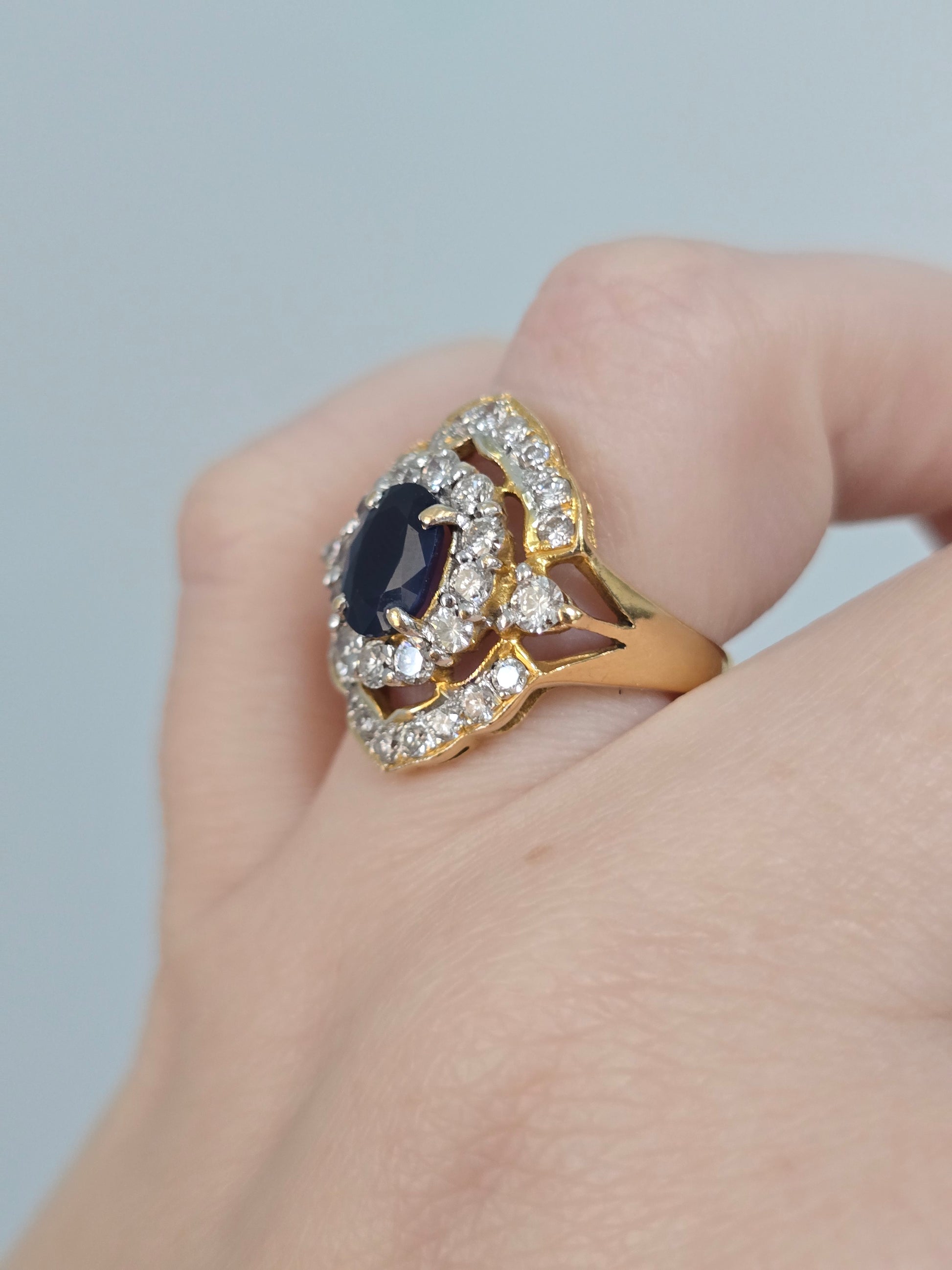 This sapphire and diamond ring is set with an oval cut sapphire of 1.28 carats, within a border of round brilliant cut diamonds totaling 1.60 carats. The ring is 6.6 grams.