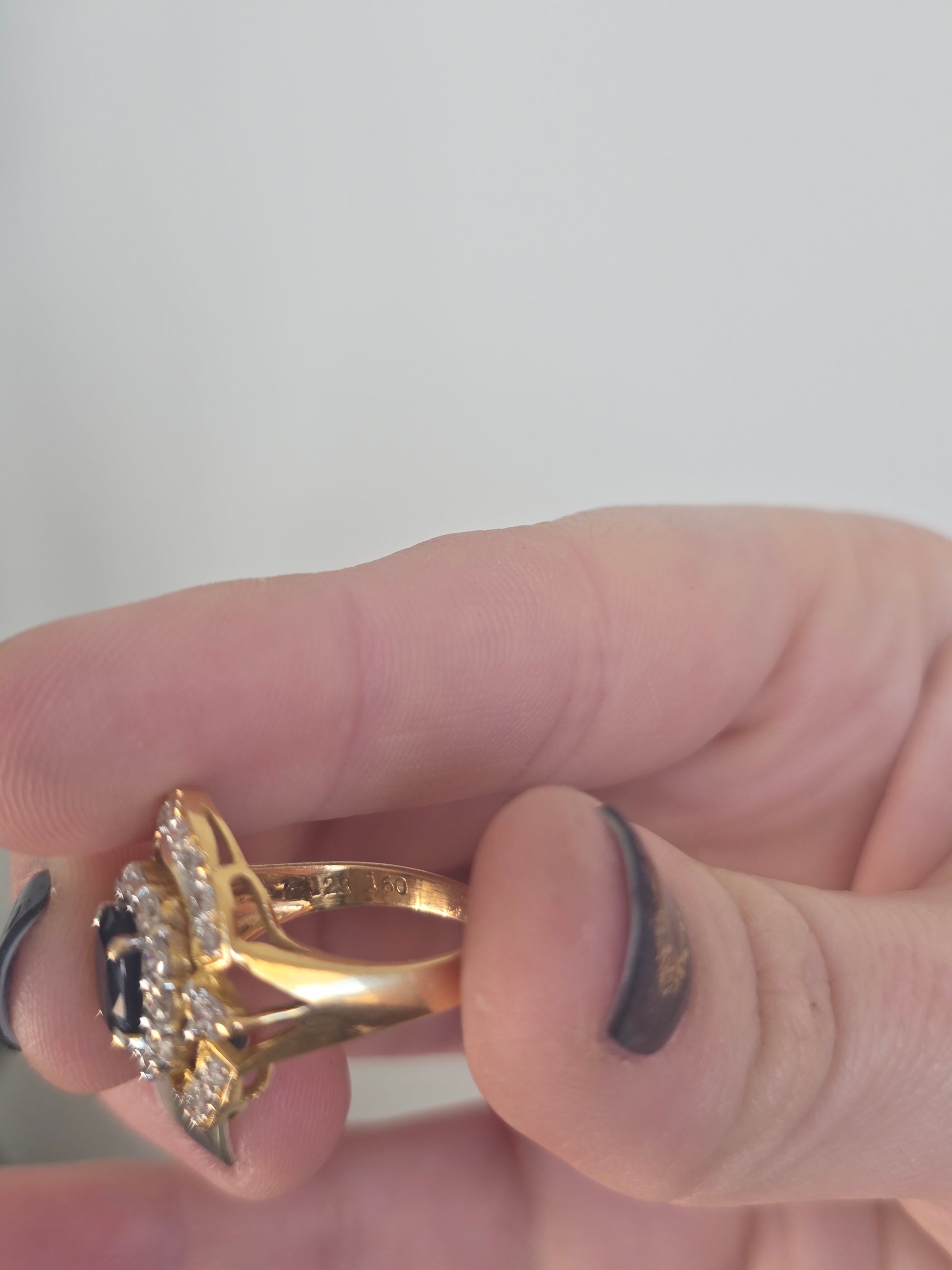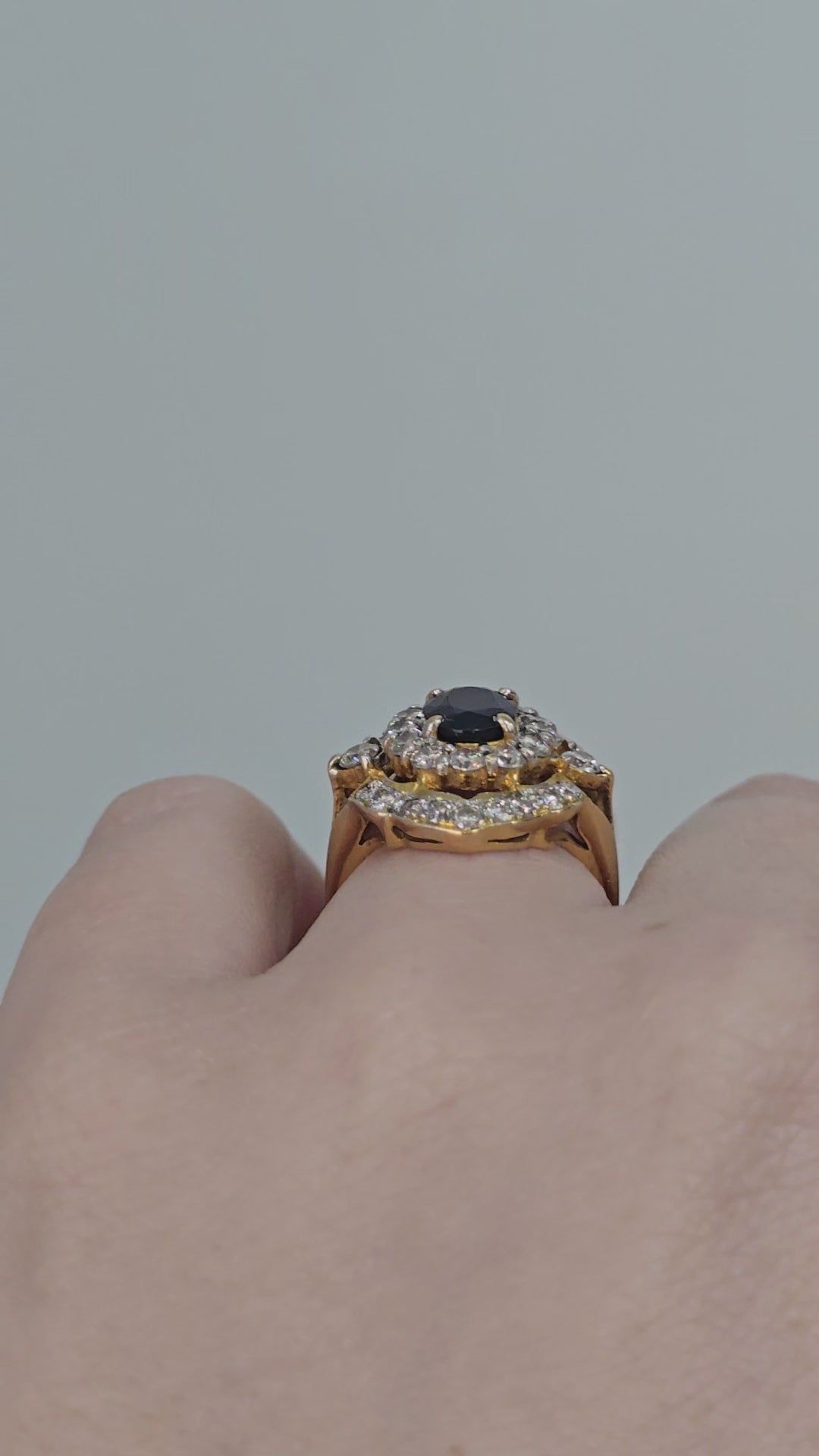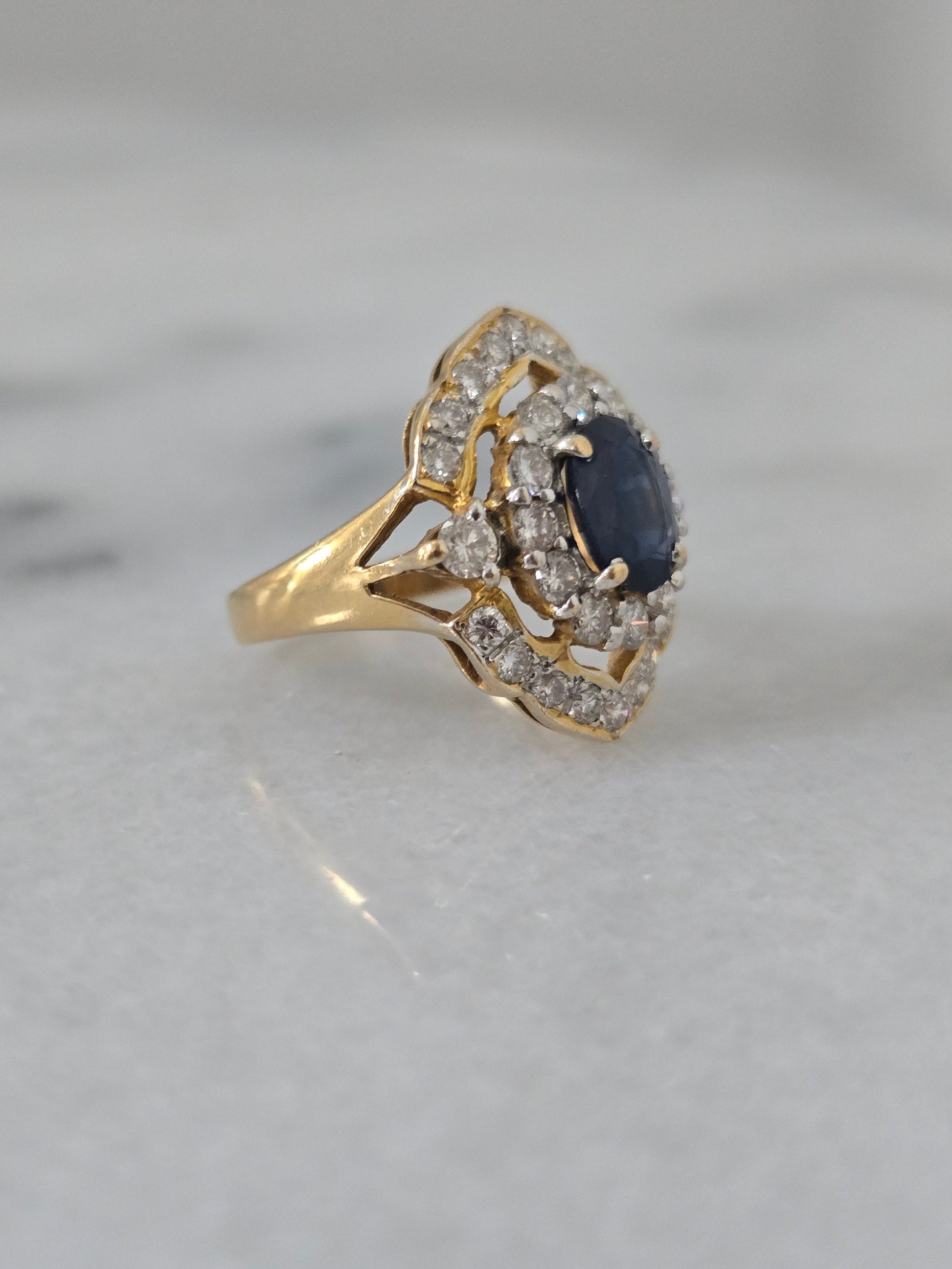 This sapphire and diamond ring is set with an oval cut sapphire of 1.28 carats, within a border of round brilliant cut diamonds totaling 1.60 carats. The ring is 6.6 grams.